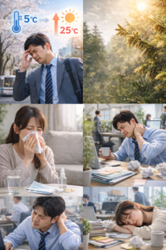 春バテは単一の原因で起こるものではありません。寒暖差、花粉、気圧変動、環境ストレス。これらが重なり合うことで生じる“複合疲労”です。