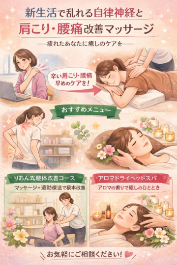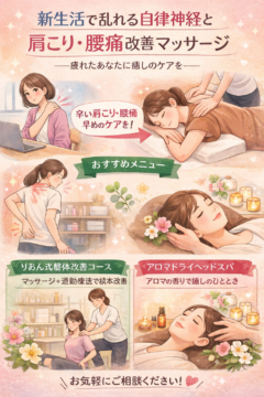 今回は、新生活で乱れやすい自律神経と肩こり・腰痛の関係、そしてマッサージによる改善について解説します。