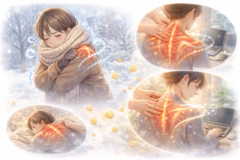 冬特有の要因として見落とされがちなのが、服装と冷えの影響です。コートやダウン、厚手のニットなど、冬の服装はどうしても重くなります。これらの重さは肩に直接の負荷をかけ、僧帽筋を常に引っ張る状態を作ります。さらに首元をすくめるような姿勢になりやすく、肩の緊張が抜けにくくなります。また、冬は「冷えが蓄積しやすい季節」でもあります。一時的に冷えるだけでなく、日々の冷えが少しずつ身体に溜まっていくことで、筋肉の柔軟性は確実に低下します。特に首・肩・背中は冷えの影響を受けやすく、一度冷えると温まりにくい部位です。この冷えた状態で日常生活を続けると、筋肉は常に防御的に硬くなり、肩こりが慢性化します。重たい服による負荷と、冷えの蓄積。この二つが重なることで、冬の肩こりはさらに深く、取れにくい状態へと進んでいくのです。