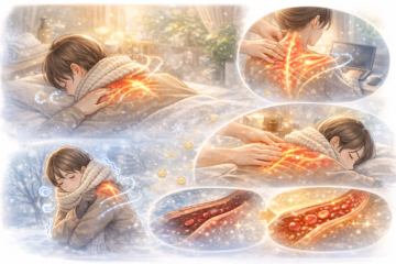 寒さを感じると、私たちの身体は体温を逃がさないように無意識に筋肉を収縮させます。これは生命維持のための自然な防御反応ですが、首や肩周りではこの反応が過剰に出やすいのが特徴です。特に僧帽筋や肩甲骨周囲の筋肉は、寒さに対して緊張しやすく、力が抜けにくくなります。この状態が続くと、筋肉は柔軟性を失い、常に力が入ったままの状態になります。筋肉が縮んだままになると、その中を通る血管も圧迫され、酸素や栄養が十分に届かなくなります。その結果、疲労物質が溜まりやすくなり、重だるさや痛みとして肩こりを感じるようになります。冬の肩こりが「ガチガチ」「石みたい」と表現されるのは、まさにこの筋収縮が長時間続いている状態です。単なる疲労ではなく、寒さによって作られた慢性的な緊張が、肩こりを深くしているのです。